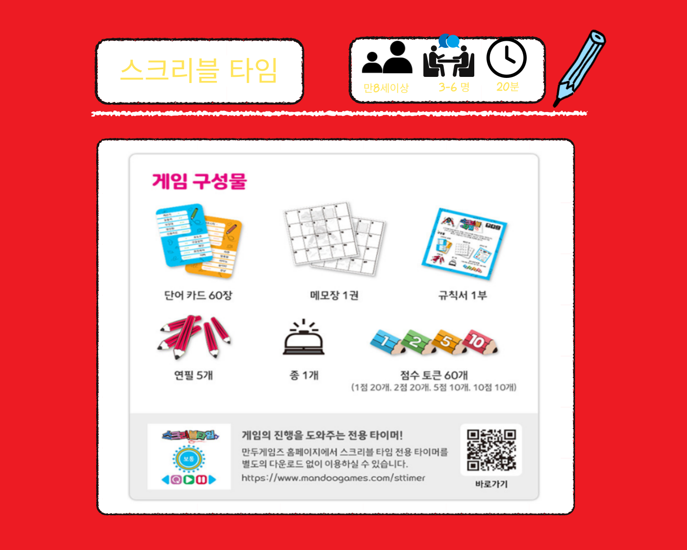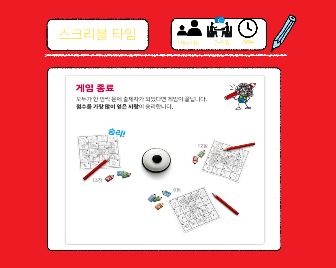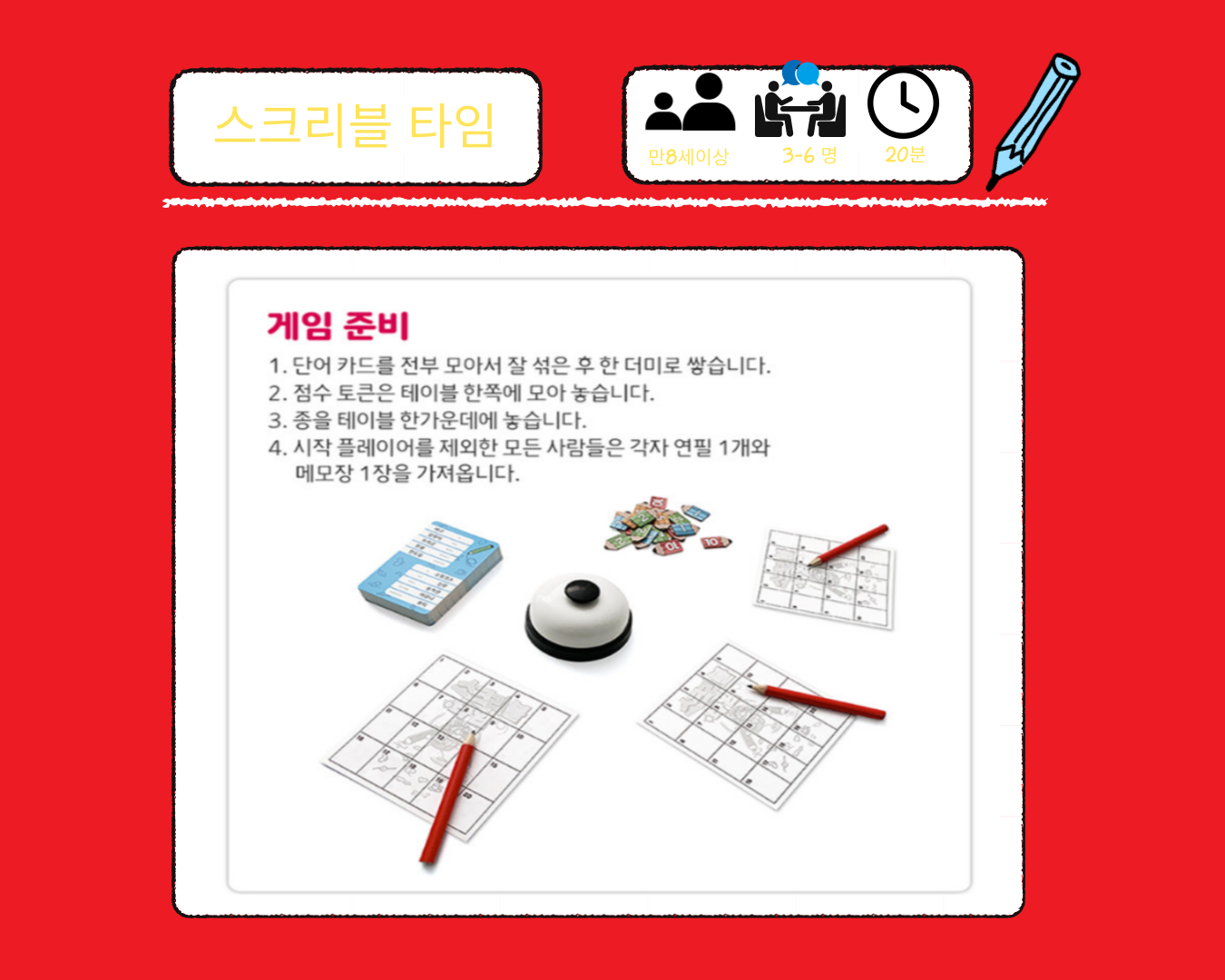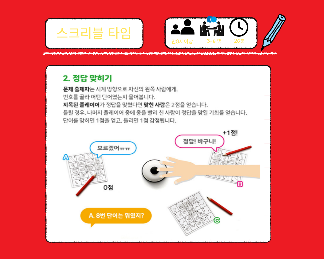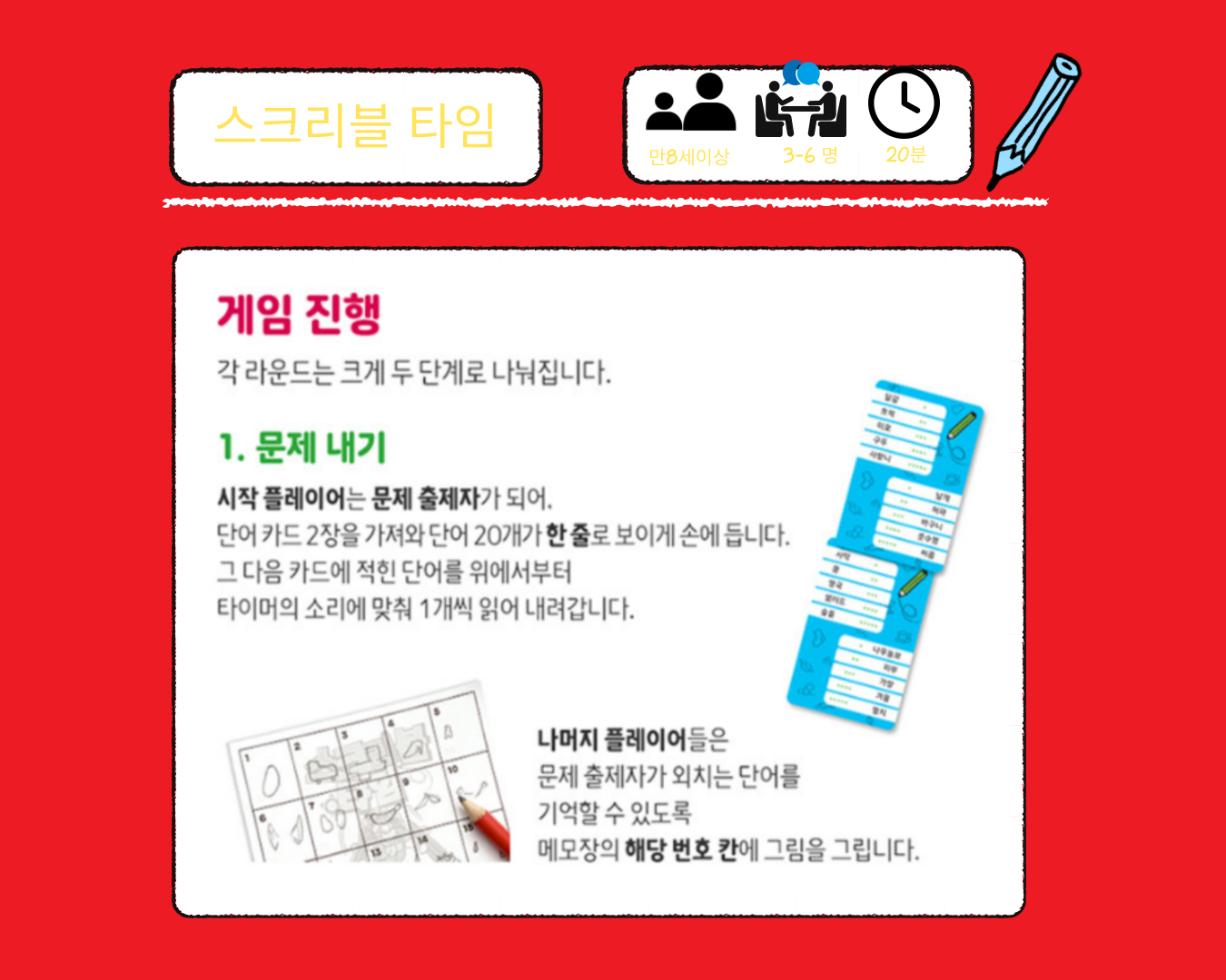 자신만이 캐치할 수 있는 단어의 특징을 빠르게 그림으로 그려 단어를 기억해 내는 순발력 파티게임,스크리블 임입니다.